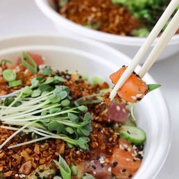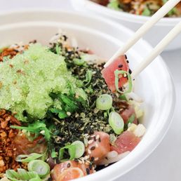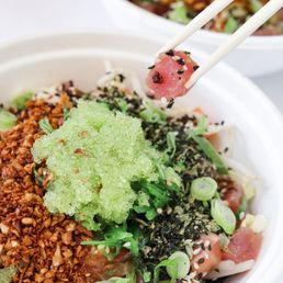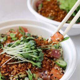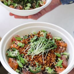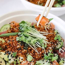 Customizable poke bowls, with fun ingredient options like forbidden rice, bamboo rice, kelp noodle salad, citrus kale, eggplants, chili oil, and mushrooms! I love how the ingredients here are unique from other poke places, while still feeling super healthy and fresh and cohesive. Got a small custom bowl with tofu and salmon and both were fantastic. The miso sauce was on the lighter side and complimented all the toppings well. The crunchy onions (they don't skimp!) added a ton of crunch but not much flavor, so I'd get the crunchy garlic next time instead. The bowl was super filling and satisfying; it's also such a good price (~$12) for a sizable bowl. Large bowls are ~$15 which is a great deal too for cali. Packaging is so cute too and feels very LA. Would definitely come back whenever I'm craving poke bowls. There's not a lot of seating inside btw, but service was quick and efficient, and the bowls came out super fast as well.